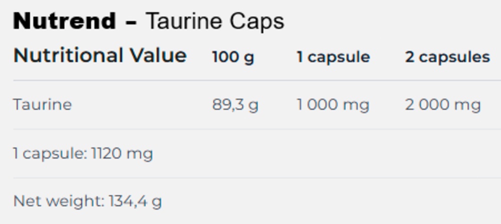Ingredients: taurine, gelatin capsule (gelatin, colouring agent iron oxide).