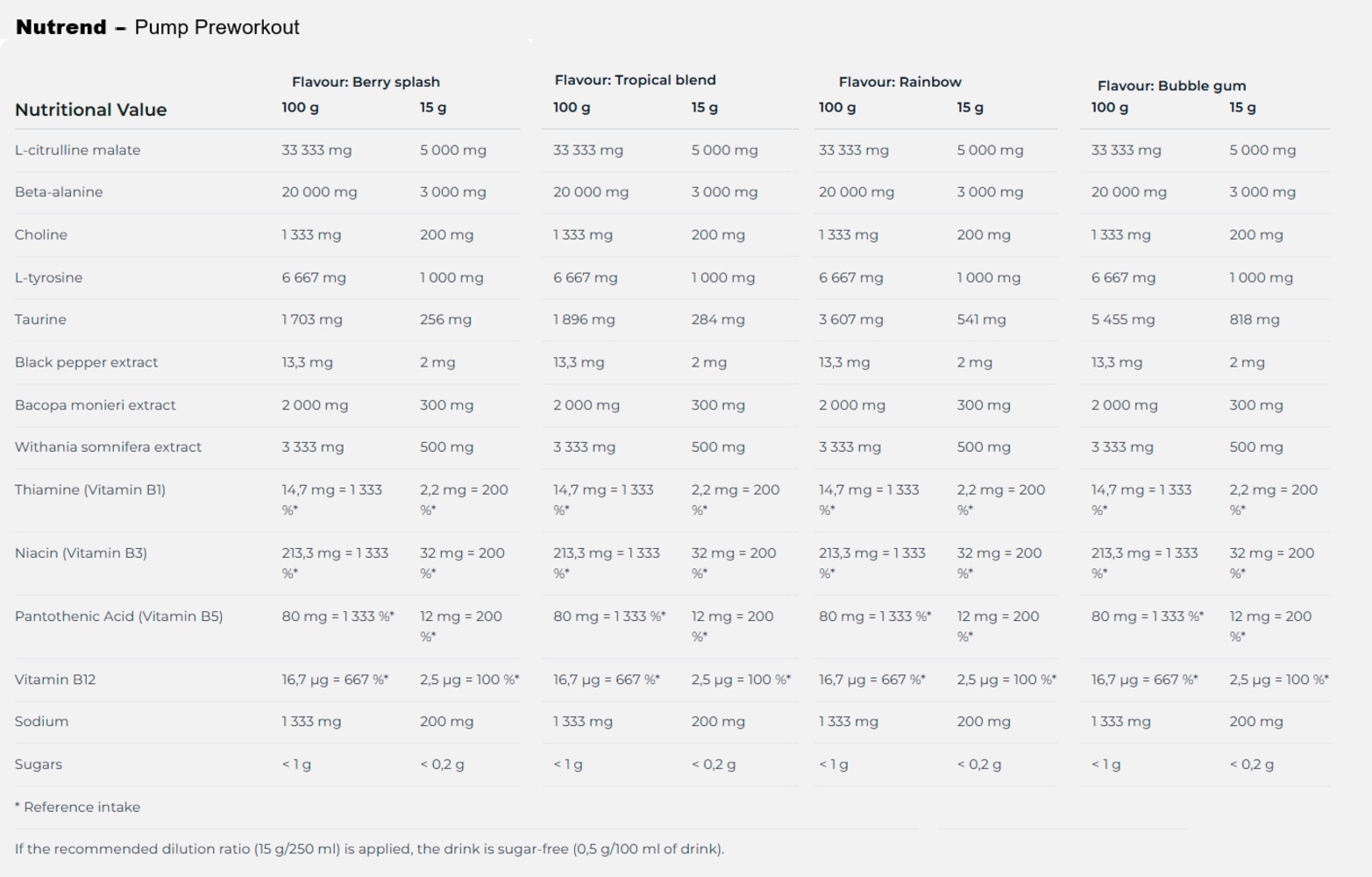 Bubble Gum: L-citrulline malate, beta-alanine, thickener glycerol monostearate 13%, L-tyrosine, taurine, anti-caking agent silicon dioxide, choline L-bitartrate, Withania somnifera extract (5% withanolides), sodium citrate, Bacopa monnieri extract, sodium chloride, anti-caking agent calcium phosphate, aroma, sweeteners sucralose and steviol-glycosides, nicotinamide, calcium D-pantothenate, thiamine hydrochloride, black pepper extract (95% piperine) – Bioperine, colouring brilliant blue FCF, cyanocobalamin.