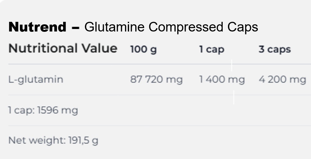 Ingredients: L-glutamine, gelatine capsule (gelatine, colouring iron oxide), bulking agent magnesium stearate, anti-caking agent silicon dioxide.