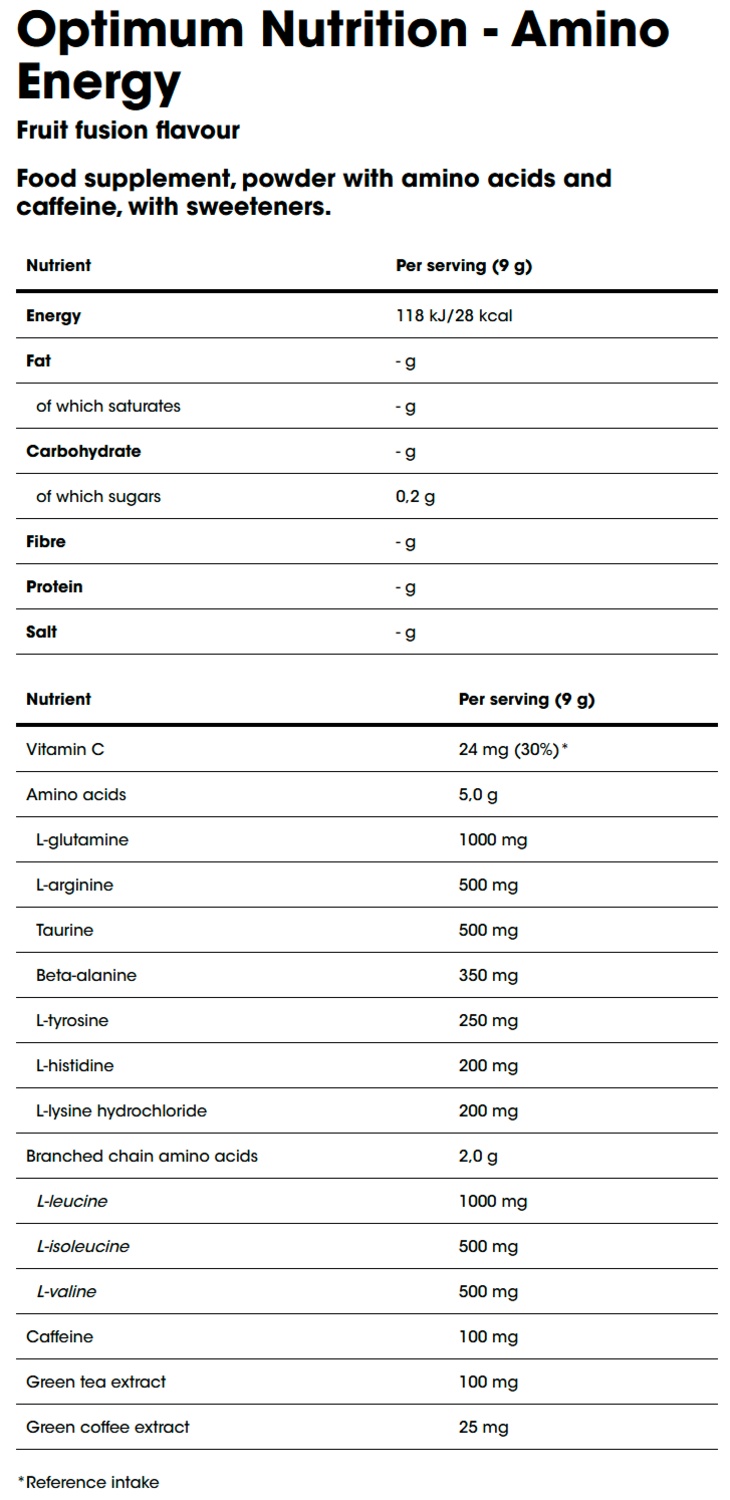 Fruit Fusion: amino acid blend (L-glutamine, L-leucine, taurine, L-arginine, L-isoleucine, L-valine, beta-alanine, L-tyrosine, L-histidine, L-lysine hydrochloride, emulsifier (sunflower lecithin)), acids (citric acid, malic acid, L-tartaric acid), flavouring, colours (beetroot red, curcumin, carotenes), inulin, sweeteners (sucralose, acesulfame K), thickeners (sodium carboxymethyl cellulose, xanthan gum, carrageenan), anti-caking agents (silicon dioxide, calcium silicate), green tea leaf extract (Camellia sinensis (L.) Kuntze), natural caffeine, L-ascorbic acid (vit. C), green coffee extract (Coffea arabica L.).