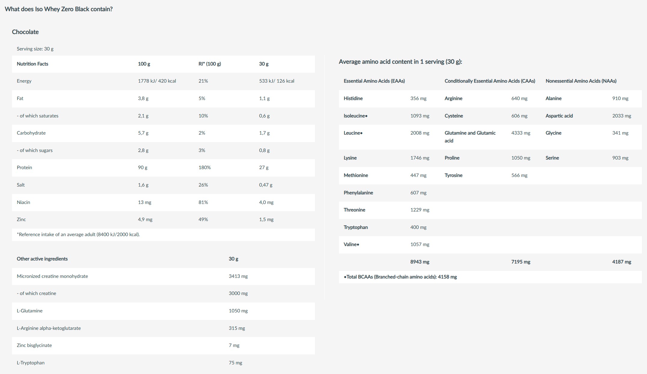 Chocolate: Instant whey protein isolate (milk) 72% [whey protein isolate (milk), emulsifier: lecithins (soy)], micronized creatine monohydrate 11.4%, fat-reduced cocoa powder, L-Glutamine, flavourings, creamer [partly hydrogenated coconut fat, skimmed milk powder, emulsifiers (E471, E472a), glucose syrup, sucrose, milk protein, stabiliser (potassium phosphates)], emulsifier: lecithins (soy), thickeners (carrageenan, xanthan gum), L-Arginine, salt, anti-caking agent (silicon dioxide), L-Tryptophan, sweetener (sucralose), zinc bisglycinate, niacin (nicotinamide, nicotinic acid)